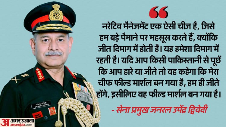 सेना प्रमुख (सीओएएस) ने कहा, ‘नैरेटिव मैनेजमेंट प्रणाली एक ऐसी चीज है, जिसका हमें बड़े पैमाने पर एहसास होता है, क्योंकि जीत मन में होती है। यह हमेशा मन में रहती है। अगर आप किसी पाकिस्तानी से पूछें कि आप हारे या जीते, तो वह कहेगा कि मेरे आर्मी चीफ फील्ड मार्शल बन गए हैं, हम ही जीते होंगे, इसलिए वह फील्ड मार्शल बने हैं।’