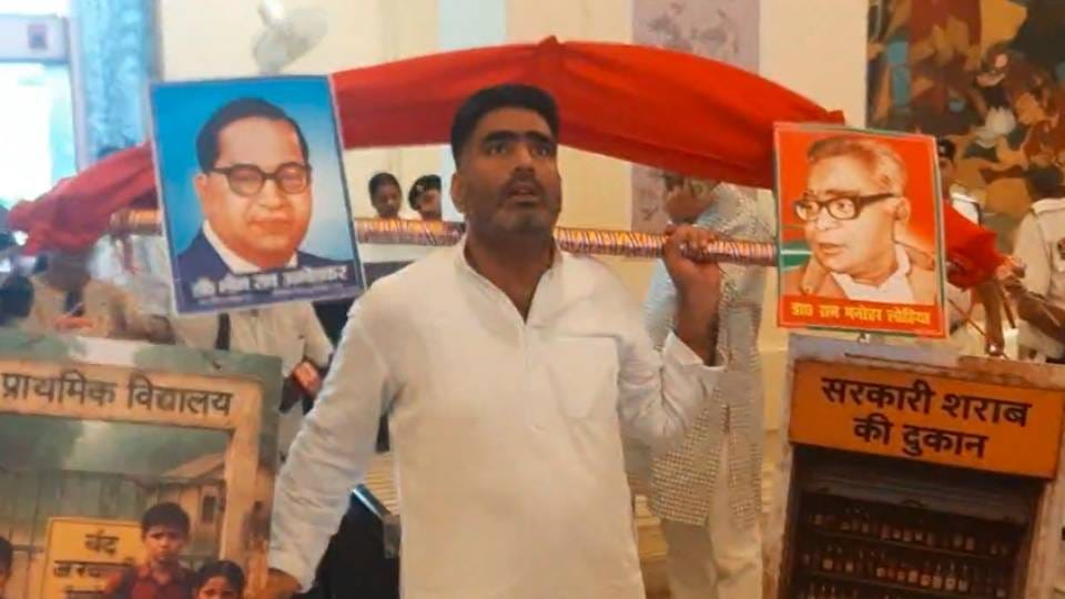 सपा विधायक अतुल प्रधान मानसून सत्र में एक अनोखी कांवड़ लेकर पहुंचे। उनके कंधे पर जो कांवड़ थी, उसमें एक तरफ सरकार स्कूल व बच्चों की तस्वीर लटक रही थी। दूसरी तरफ सरकारी शराब की दुकान की तस्वीर लटक रही थी। वहीं ऊपर डंडे पर बाबा साहेब और राम मनोहर लोहिया की तस्वीर लगा रखी थी।