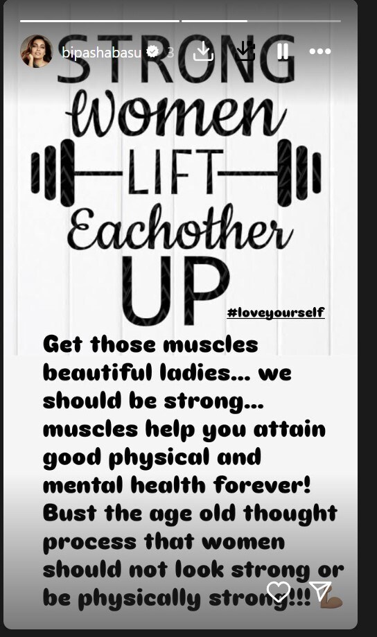 बिपाशा बसु ने इंस्टाग्राम पोस्ट में कहा, ‘मजबूत औरत हमेशा दूसरे को भी ऊपर उठाती हैं. खूबसूरत औरतों, तुम सब अपने मसल्स बढ़ाओ. हम सबको ऐसा ही मजबूत होने की जरूरत है. मसल्स भी आपको स्ट्रॉन्ग बनाता है. ये आपको अच्छा शारीरिक और मानसिक हेल्थ देने में भी हेल्प करता है. इस पुरानी सोच को तोड़ो कि महिलाओं को मजबूत दिखना या शारीरिक रूप से मजबूत होना जरूरी नहीं है.’