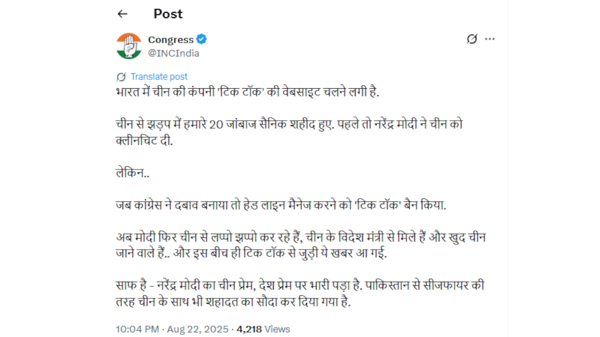 पीएम मोदी पर निशाना साधते हुए कांग्रेस ने एक्स पर लिखा कि भारत में चीन की कंपनी ‘टिक टॉक’ की वेबसाइट चलने लगी है। चीन से झड़प में हमारे 20 जांबाज सैनिक शहीद हुए। पहले तो नरेंद्र मोदी ने चीन को क्लीनचिट दी। लेकिन.. जब कांग्रेस ने दबाव बनाया तो हेड लाइन मैनेज करने को ‘टिक टॉक’ बैन किया। अब मोदी फिर चीन से लप्पो झप्पो कर रहे हैं, चीन के विदेश मंत्री से मिले हैं और खुद चीन जाने वाले हैं.. और इस बीच ही टिक टॉक से जुड़ी ये खबर आ गई।