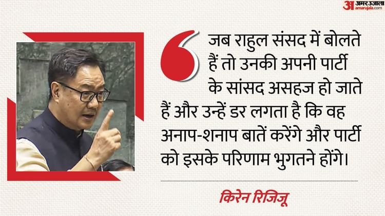 रिजिजू ने दावा किया कि राहुल गांधी के अपने ही पार्टी सांसद उनके भाषणों से परेशान रहते हैं। उन्होंने कहा कि राहुल गांधी कुछ भी बोलते हैं तो उनके सारे सांसद असहज हो जाते हैं। उन्हें डर रहता है कि वे अनाप-शनाप बातें करेंगे और उसकी सजा पार्टी को भुगतनी पड़ेगी।