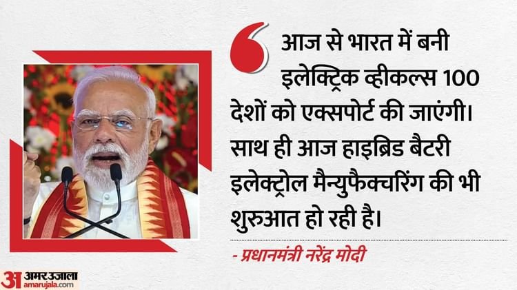 अपने संबोधन के दौरान पीएम मोदी ने कहा, ‘गणेश उत्सव के इस उल्लास में आज भारत की ‘मेक इन इंडिया’ यात्रा में एक नया अध्याय जुड़ रहा है। मेक इन इंडिया, मेक फॉर द वर्ल्ड हमारे उस लक्ष्य की ओर एक बड़ी छलांग है। आज से भारत में बनी इलेक्ट्रिक व्हीकल्स 100 देशों को एक्सपोर्ट की जाएंगी। साथ ही आज हाइब्रिड बैटरी इलेक्ट्रोल मैन्युफैक्चरिंग की भी शुरुआत हो रही है।’