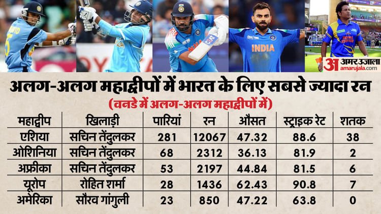 भारतीय बल्लेबाजों ने न सिर्फ वनडे क्रिकेट में, बल्कि तीनों प्रारूपों में एशिया के साथ-साथ दुनिया के अलग-अलग महाद्वीपों पर भी अपनी बल्लेबाजी का लोहा मनवाया है। सचिन तेंदुलकर का दबदबा एशिया से लेकर अफ्रीका और ओशिनिया तक देखने को मिला, वहीं यूरोप में रोहित शर्मा और अमेरिका में सौरव गांगुली ने भारतीय क्रिकेट का परचम लहराया। इन रिकॉर्ड्स ने साबित किया है कि भारतीय बल्लेबाजी हर परिस्थिति और हर पिच पर दमखम दिखाने में माहिर रही है। हम आपको अलग-अलग महाद्वीपों पर वनडे में और तीनों प्रारूपों को मिलाकर भारत के सबसे ज्यादा रन बनाने वाले बल्लेबाजों के बारे में बताएंगे।