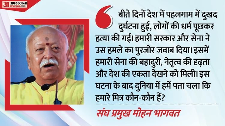 मोहन भागवत ने कहा, सीमा पार से आए आतंकवादियों ने 26 भारतीयों का धर्म पूछकर उनकी हत्या कर दी। इस आतंकी हमले से देश शोक और आक्रोश में था। पूरी तैयारी के साथ हमारी सरकार और सशस्त्र बलों ने करारा जवाब दिया। सरकार का समर्पण, सशस्त्र बलों का पराक्रम और समाज में एकता ने देश में एक आदर्श वातावरण प्रस्तुत किया। इस घटना और हमारे ऑपरेशन के बाद विभिन्न देशों द्वारा निभाई गई भूमिका ने हमारे सच्चे मित्रों को उजागर किया। देश के भीतर भी ऐसे असंवैधानिक तत्व हैं जो देश को अस्थिर करने का प्रयास करते हैं।