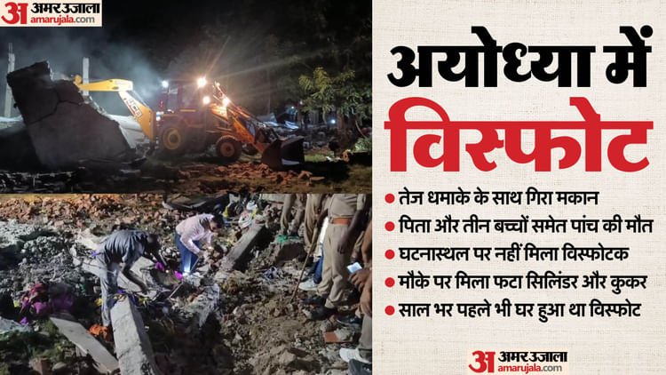 अयोध्या के हनुमत नगर में तेज धमाके के साथ बृहस्पतिवार देर शाम 7.30 बजे मकान गिरने से पांच लोगों की मौत हो गई। इनमें तीन बच्चे, उनके पिता और एक मजदूर शामिल हैं। बचाव कार्य जारी है। लेकिन मलबे में अन्य कोई घायल नहीं मिला है। पटाखा या रसोई गैस सिलिंडर से धमाके की आशंका जताते हुए पुलिस जांच में जुटी है। मुख्यमंत्री योगी आदित्यनाथ ने स्थिति पर नजर रखने के निर्देश दिए हैं।