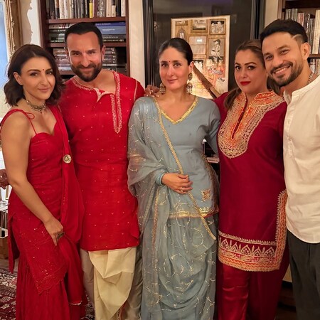 सोहा, सैफ और अमृता अरोड़ा लाल पारंपरिक परिधानों में एक साथ नजर आए, वहीं करीना नीले लहंगे में बेहद स्टाइलिश दिखीं. सोहा ने अपनी पोस्ट के कैप्शन में लिखा, “कल रात हाई एनर्जी के साथ जश्न की शुरुआत हुई, धनतेरस की शुभकामनाएं.”