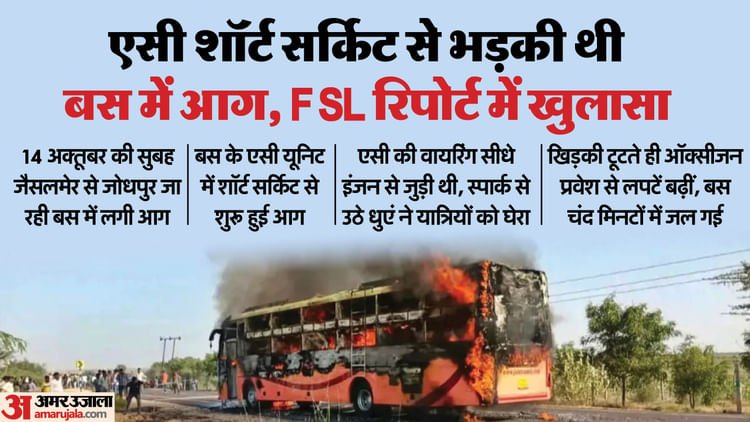 जैसलमेर जिले के थैयत गांव के पास हुए दर्दनाक बस हादसे की फॉरेंसिक रिपोर्ट (FSL) सामने आ गई है। रिपोर्ट में पुष्टि हुई है कि यह हादसा बस के एयर-कंडीशनिंग सिस्टम (AC) में हुए शॉर्ट सर्किट के कारण हुआ था। यह हादसा 14 अक्तूबर को उस समय हुआ जब एक निजी बस जैसलमेर से जोधपुर जा रही थी और रवाना होने के करीब 10 मिनट बाद ही उसमें आग लग गई। इस भीषण आग में 26 यात्रियों की मौत हो गई थी।