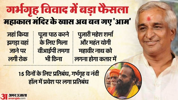 श्री महाकालेश्वर प्रबंध समिति के प्रशासक प्रथम कौशिक ने बताया कि जांच दल की रिपोर्ट के अनुसार दोनों पक्षों का आचरण मंदिर की गरिमा के विपरीत पाया गया है। इसी आधार पर पुजारी महेश शर्मा और महंत योगी महावीर नाथ पर 15 दिन के लिए मंदिर में विशिष्ट माध्यमों से दर्शन पर प्रतिबंध लगा दिया गया है।
