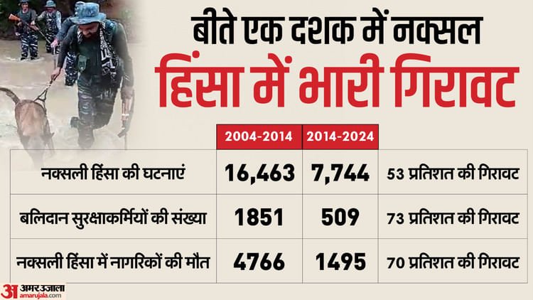नक्सलवाद के खिलाफ केंद्र सरकार सुरक्षा, विकास और पुनर्वास की समन्वित रणनीति से बुनियादी बदलाव लेकर आई है। सरकार ने मार्च 2026 तक देश को नक्सलवाद से मुक्त करने का लक्ष्य रखा है। सरकार ने जो आंकड़ें पेश किए हैं, उनके मुताबिक साल 2004 से 2014 के बीच देश में नक्सली हिंसा की 16,463 घटनाएं हुईं, जो 2014-2024 में ये घटकर 7,744 रह गईं। इस तरह नक्सली हिंसा में बीते दशक की तुलना में 53 फीसदी की गिरावट आई है। 2004-2014 के दशक में नक्सल ऑपरेशन में बलिदान हुए जवानों की संख्या 1851 थी, और 2014-2024 के दशक में यह आंकड़ा 509 जवान रहा। इस तरह इसमें 73 प्रतिशत की कमी आई। साल 2025 में सुरक्षाबलों ने 270 नक्सलियों को ढेर किया और 680 को गिरफ्तार किया गया। इस दौरान 1225 नक्सलियों ने आत्मसमर्पण किया।
