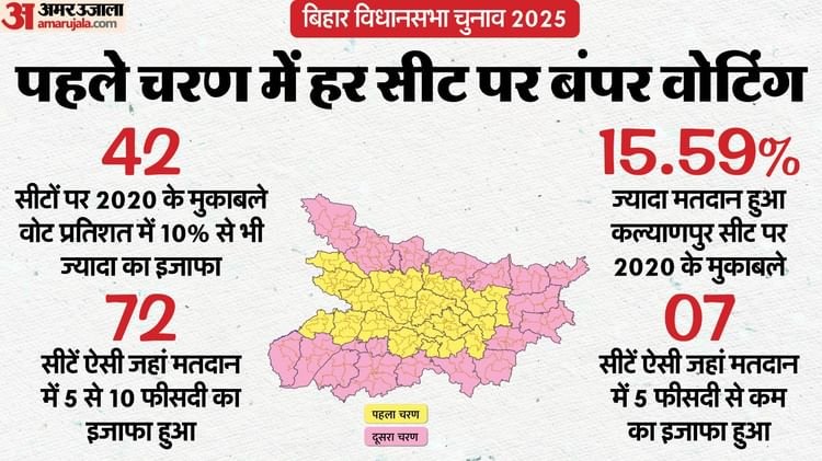 बिहार में गुरुवार को 121 सीटों पर मतदान हुआ । 2020 में इन 121 सीटों पर 57 फीसदी से ज्यादा वोटिंग हुई थी। वहीं, इस बार बढ़कर 64.69 फीसदी हो गई है। आइये जानते हैं पहले चरण की सभी 121 सीटों की वोटिंग का हाल…