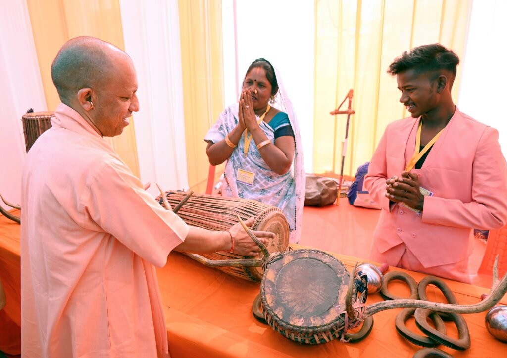 सोनभद्र/एबीएन न्यूज। जनजातीय गौरव दिवस के अवसर पर प्रदेश के मुख्यमंत्री योगी आदित्यनाथ सोनभद्र जनपद के चोपन स्थित रेल कर्मचारी इंटर कॉलेज पहुंचे, जहां जनपद के जनप्रतिनिधियों व अधिकारियों ने पुष्पगुच्छ भेंटकर उनका स्वागत किया। मुख्यमंत्री ने रेलवे खेल मैदान में विभिन्न विभागों द्वारा लगाई गई प्रदर्शनियों का अवलोकन किया और जनजातीय संस्कृति से जुड़े ‘मांदर’ वाद्ययंत्र को बजाकर लोगों की सराहना बटोरी। वहीं बाल विकास विभाग की प्रदर्शनी में अन्नप्राशन संस्कार भी सम्पन्न कराया।