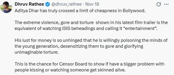 नई दिल्ली. बॉलीवुड स्टार रणवीर सिंह की फिल्म धुरंधर की रिलीज को कुछ ही दिन बचे हैं. इस बीच मेकर्स ने 18 नवंबर को फिल्म का ट्रेलर रिलीज कर दिया, जिसे लोगों ने बहुत पसंद किया. कई लोगों ने ट्रेलर की तारीफ की, लेकिन इन्फ्लूएंसर और एक्टिविस्ट ध्रुव राठी को ट्रेलर पसंद नहीं आया और उन्होंने डायरेक्टर आदित्य धर की आलोचना कर दी. ध्रुव राठी ने कहा कि बॉलीवुड में घटियापन की हद पार हो गई है. ध्रुव राठी का ऐसा कहना रणवीर शौरी को पसंद नहीं आया फिर और दोनों के बीच बहसबाजी शुरू हो गई.