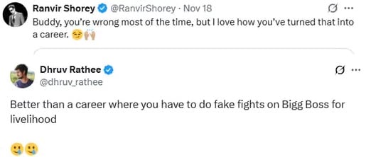 ध्रुव राठी के इस पोस्ट पर रणवीर शौरी ने करारा जवाब दिया है. उन्होंने प्रतिक्रिया देते हुए लिखा, ‘दोस्त, तुम ज्यादातर समय गलत होते हो, लेकिन मुझे पसंद है कि तुमने इसे भी एक करियर में बदल लिया है.’ इसके जवाब में ध्रुव राठी ने रणवीर शौरी पर तंज कसते हुए लिखा, ‘उस करियर से तो बेहतर है, जिसमें आजीविका के लिए बिग बॉस में नकली लड़ाइयां करनी पड़ती हैं.’ इस बीच रणवीर शौरी भी चुप नहीं बैठे और उन्होंने जवाब दिया, ‘बिग बॉस हाउस की लड़ाइयां तुम्हारी तरह आधी भी नकली नहीं हैं, दोस्त. लगे रहो.’