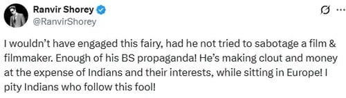 यह बहस तब और बढ़ गई जब एक यूजर ने रणवीर शौरी से ध्रुव राठी को जवाब न देने की सलाह दी. एक्टर ने अपनी बात खत्म करते हुए लिखा. ‘अगर इस बावले ने किसी फिल्म और फिल्ममेकर को नुकसान पहुंचाने की कोशिश नहीं की होती, तो मैं इससे कभी नहीं उलझता. ये यूरोप में बैठकर भारतीयों और उनके हितों की कीमत पर क्लाउट और पैसे कमा रहा है. मुझे उन भारतीयों पर दया आती है जो इस मूर्ख को फॉल करते हैं.’