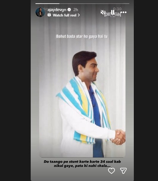 रोमांटिक-एक्शन ‘फूल और कांटे’ अजय देवगन के करियर की पहली फिल्म थी, जो एक बड़ी हिट भी साबित हुई थी. इस फिल्म के लिए अजय को बेस्ट न्यूकमर एक्टर का अवॉर्ड मिला था. देखते ही देखते अजय देवगन ने फिल्म इंडस्ट्री में 34 साल पूरे कर लिए हैं. इस मौके पर उन्होंने सोशल मीडिया पर एक वीडियो पोस्ट किया है, जिसे फैंस बहुत पसंद कर रहे हैं.