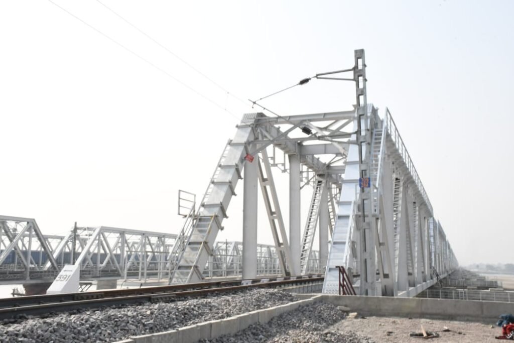इसके बाद मेजर गर्डर ब्रिज संख्या 391 पर ओवरहेड ट्रैक्शन लाइन की मानक ऊँचाई, फिटिंग्स और सुरक्षा पहलुओं का बारीकी से निरीक्षण किया गया। श्री सिंघल ने कार्य की गुणवत्ता को संतोषजनक बताया।