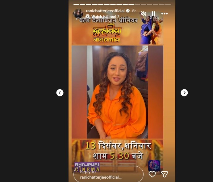 रानी चटर्जी ने इंस्टाग्राम स्टोरी पर एक वीडियो शेयर किया, जिसमें वह कहती हैं, ‘नमस्कार दोस्तों, एक बहुत ही पारिवारिक फिल्म दुल्हनियां नाच नचाये का वर्ल्ड टेलीविजन प्रीमियर होने जा रहा है. ये फिल्म आ रही है 13 दिसंबर शाम 5:30 बजे और 14 दिसंबर सुबह 9:30 बजे भोजपुरी सिनेमा पर और दंगल ऐप पर. फिल्म को जरूर देखिएगा और फिल्म की पूरी टीम को मेरी शुभकामनाएं.’