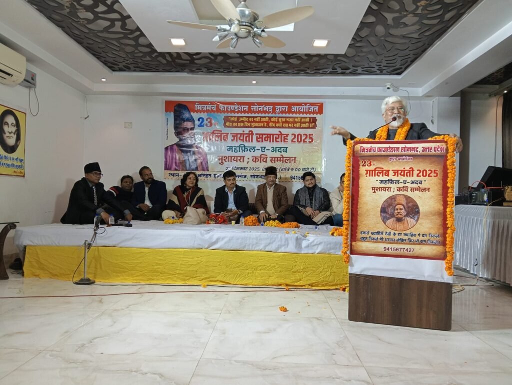सोनभद्र/एबीएन न्यूज। मिर्ज़ा ग़ालिब की 228वीं जयंती के अवसर पर मित्रमंच फाउंडेशन, सोनभद्र द्वारा आयोजित 23वां सालाना मुशायरा एवं कवि सम्मेलन राबर्ट्सगंज की सांस्कृतिक विरासत को नई ऊँचाइयों पर ले गया। 27 दिसंबर 2025 की रात होटल अरिहंत के हॉल में आयोजित इस साहित्यिक महफ़िल ने गंगा-जमुनी तहज़ीब की खुशबू से पूरे माहौल को महका दिया। देशभर से पधारे नामचीन शायरों, कवियों और एक कवयित्री ने अपनी गज़लें, नज़्में और गीत पेश कर श्रोताओं को मंत्रमुग्ध कर दिया।