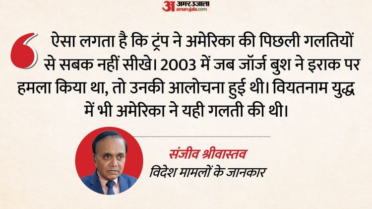 श्रीवास्तव बताते हैं कि ऐसा लगता है कि ट्रंप ने अमेरिका की पिछली गलतियों से सबक नहीं सीखे। 9/11 हमलों के बाद अमेरिका ने अफगानिस्तान पर हमले को जायज ठहराने की कोशिश की, लेकिन 2003 में जब जॉर्ज बुश ने इराक पर हमला किया, तो उनके इस कदम की आलोचना हुई। मकसद सद्दाम हुसैन को हटाना था। वहां व्यापक नरसंहार के कोई हथियार नहीं मिले। युद्ध में कई अमेरिकी सैनिकों की जान गई। वियतनाम युद्ध में भी अमेरिका ने यही गलती की थी।