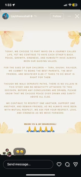इंस्टाग्राम पर कपल ने अपने तलाक को कंफर्म करते हुए एक लंबा सा पोस्ट शेयर किया जिसमें उन्होंने कहा कि वो 15 साल बाद अपनी राहें अलग कर रहे हैं, लेकिन वो अपनी बेटी तारा की परवरिश साथ मिलकर करेंगे. कपल इंस्टाग्राम स्टोरी पर पोस्ट में लिखते हैं, ‘आज हम जिंदगी के सफर में अलग होने का फैसला कर रहे हैं, लेकिन फिर भी हम एक-दूसरे का साथ देते रहेंगे. शांति, विकास, दयालुता और इंसानियत हमेशा हमारे मार्गदर्शक मूल्य रहे हैं. अपने बच्चों तारा, खुशी और राजवीर के लिए हम वादा करते हैं कि हम सबसे अच्छे माता-पिता, सबसे अच्छे दोस्त और जो भी जरूरी होगा, वही बनेंगे, ताकि उनके लिए सही कर सकें’.