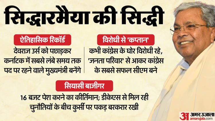 कर्नाटक में कुछ दिनों पहले मुख्यमंत्री पद के लिए खींचतान चली। इस समय सिद्धारमैया को कुछ तनावपूर्ण क्षणों का सामना भी करना पड़ा। हालांकि सिद्धारमैया ने अब एक नया रिकॉड अपने नाम कर लिया हैं। वह कर्नाटक के सबसे लंबे समय तक मुख्यमंत्री रहने वाले व्यक्ति बन गए हैं। सिद्धारमैया दो दशकों से अधिक समय से जनता परिवार से जुड़े रहे। इस समय वह कांग्रेस विरोधी मुखर रुख के लिए जाने गए, लेकिन 77 वर्षीय व्यक्ति के लिए यह एक उल्लेखनीय बदलाव रहा है। उन्होंने मंगलवार को अपने साथी मैसूर निवासी देवराज उर्स के कार्यकाल के दिनों की संख्या के रिकॉर्ड की बराबरी कर ली।