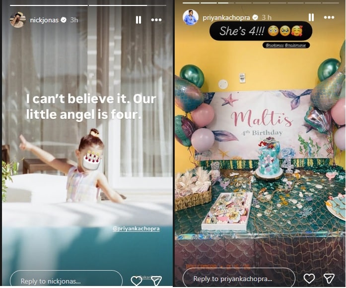निक जोनास ने भी अपनी बेटी के जन्मदिन पर एक प्यारी तस्वीर शेयर की, हालांकि उन्होंने मालती के चेहरे को केक इमोजी से ढक रखा था. इसके साथ उन्होंने भावुक शब्दों में लिखा, ‘मुझे यकीन नहीं हो रहा कि मेरी नन्ही परी अब चार साल की हो गई है.’ इस खास मौके पर प्रियंका की मां मधु चोपड़ा ने भी अपनी नातिन मालती के लिए एक भावुक संदेश लिखा. उन्होंने लिखा, ‘मालती ने मुझे नानी बनाया और मेरी जिंदगी को खुशियों और जादू से भर दिया. आपको ढेर सारा प्यार और जन्मदिन की शुभकामनाएं.’
