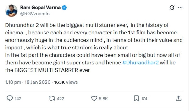 रणवीर सिंह की फिल्म को लेकर दर्शकों के जबरदस्त क्रेज बना हुआ है. फिल्म रिलीज के इतने दिनों बाद भी कमाई कर रही हैं. अब फिल्म के दूसरे पार्ट को लेकर भी खबरें सामने आ रही है. हाल ही में राम गोपाल वर्मा ने सोशल मीडिया प्लेटफॉर्म X पर एक पोस्ट शेयर की है. उन्होंने अपनी पोस्ट में लिखा है कि धुरंधर 2 सिनेमा के इतिहास की सबसे बड़ी मल्टीस्टारर फिल्म साबित होने वाली है. इस फिल्म के सभी किरदार सुपरस्टार बन चुके हैं.