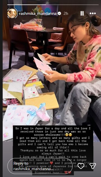रश्मिका ने लिखा, ‘मैं सिर्फ एक दिन के लिए जापान में थी, लेकिन इतने कम समय में जो सच्चा प्यार मिला, वह मेरे लिए बेहद खास है. मैंने हर एक चिट्ठी पढ़ी और हर तोहफे को संभालकर घर लाई हूं. यह सब देखकर मैं सच में बहुत इमोशनल हो गई.’