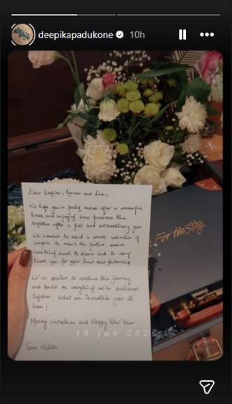 दीपिका ने अपनी स्टोरी में एक बेहद प्यारी और निजी झलक साझा की, जिसमें उनकी नन्ही बेटी बेबी दुआ को मिल रहे प्यार और तोहफों की झलकियां साफ दिख रही हैं. तस्वीर में ताजे फूलों की खूबसूरत सजावट और एक एलिगेंट गिफ्ट बॉक्स नजर आया, लेकिन इस पूरे पल की सबसे खास बात थी एक हाथ से लिखा नोट, जो दीपिका पादुकोण, रणवीर सिंह और बेबी दुआ के नाम था. यह छोटा सा नोट अपने आप में ढेर सारी भावनाएं समेटे हुए था.