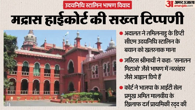 मद्रास हाईकोर्ट की मदुरै पीठ ने सोमवार को तमिलनाडु के डिप्टी सीएम उदयनिधि स्टालिन के उस बयान पर सख्त टिप्पणी की, जिसमें उदयनिधि स्टालिन ने अपने एक संबोधन में सनातन धर्म का सफाया करने की मांग की थी। कोर्ट ने साफ कहा कि उदयनिधि स्टालिन का बयान नरसंहार की मांग जैसा है। हाईकोर्ट की पीठ ने भाजपा की आईटी सेल के प्रमुख अमित मालवीय को राहत देते हुए उनके खिलाफ दर्ज एफआईआर को भी रद्द करने का आदेश दिया।