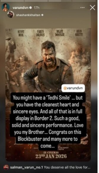 हाल ही में वरुण धवन ने अपने इंस्टाग्राम पर डायरेक्टर शशांक खेतान द्वारा लिखा गया अपने परफॉर्मेंस का रिव्यू री-शेयर किया. शशांक ने वरुण की तारीफ करते हुए लिखा कि भले ही उनकी मुस्कान थोड़ी टेढ़ी हो, लेकिन वह दिल के बहुत साफ है और उनकी आंखों में सच्चाई साफ देखने को मिलती है. बॉर्डर 2 में भी उनकी ये ईमानदारी और मेहनत साफ नजर आई है. उन्होंने वरुण के काम को मजबूत, ईमानदार और शानदार बताया और इस ब्लॉकबस्टर फिल्म के लिए उन्हें बधाई भी दी है.