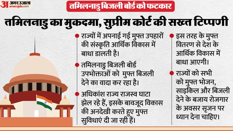 सुप्रीम कोर्ट ने तमिलनाडु सरकार को कड़ी फटकार लगाई है। दरअसल, राज्य सरकार ने कुछ समुदायों के लिए बिजली टैरिफ में सब्सिडी स्कीम की घोषणा की थी। इससे पावर डिस्ट्रीब्यूशन कंपनी पर फाइनेंशियल दबाव पड़ा। राज्य सरकार के फैसले के खिलाफ पावर डिस्ट्रिब्यूशन कंपनियों ने सुप्रीम कोर्ट का दरवाजा खटखटाया है। इस दौरान कोर्ट ने कहा कि राज्यों में अपनाई गई मुफ्त सुविधाओं की संस्कृति आर्थिक विकास में बाधा डालती है।