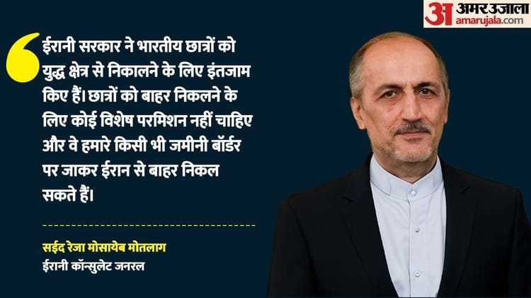 मुंबई में इस्लामिक रिपब्लिक ऑफ ईरान के कॉन्सुलेट जनरल सईद रेजा मोसायेब मोतलाग ने बताया कि ईरान ने भारत सरकार के साथ मिलकर भारतीय छात्रों को ईरान से निकालने के लिए सभी जरूरी इंतजाम कर लिए हैं। उन्होंने बताया कि ईरानी सरकार ने भारतीय छात्रों को युद्ध क्षेत्र से निकालने के लिए इंतजाम किए हैं। छात्रों को बाहर निकलने के लिए कोई विशेष परमिशन नहीं चाहिए और वे हमारे किसी भी जमीनी बॉर्डर पर जाकर ईरान से बाहर निकल सकते हैं।