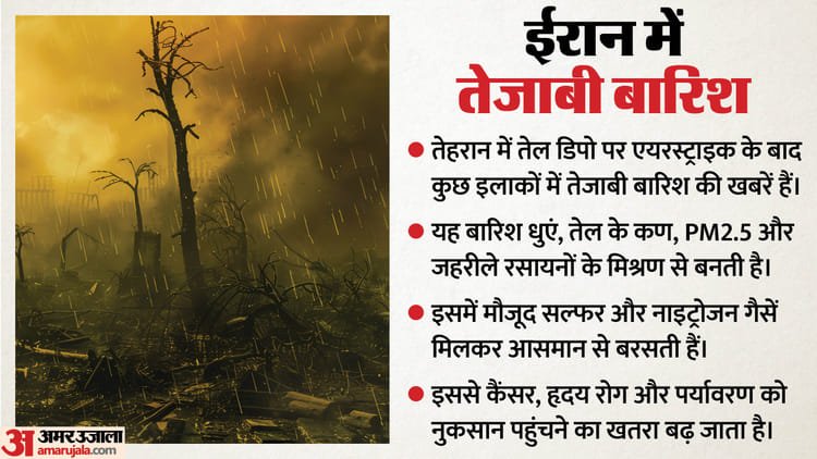 ईरान में सप्ताहांत में तेल डिपो पर हुए अमेरिका-इस्राइल के हवाई हमलों के बाद कुछ इलाकों में काली बारिश होने की खबरें सामने आ रही हैं। कई मीडिया रिपोर्टों में इसे एसिड रेन बताया जा रहा है। स्थानीय लोगों के अनुसार बारिश का पानी काला दिखाई दे रहा है और उसमें तेल जैसी परत भी देखी जा रही है, जो इमारतों और वाहनों पर जम रही है। कुछ लोगों ने सिरदर्द और सांस लेने में दिक्कत की शिकायत भी की है। ईरान की रेड क्रिसेंट सोसाइटी ने भी चेतावनी दी है कि इन हमलों के बाद होने वाली बारिश बेहद खतरनाक और अम्लीय हो सकती है।