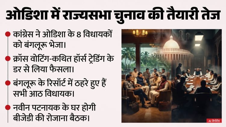 देशभर की सियासत में राज्यसभा चुनाव को लेकर गर्माहट बढ़ गया है। दूसरी ओर इस चुनाव को लेकर राजनीतिक पार्टियों ने अपनी-अपनी तैयारी भी तेज कर दी है। इसी बीच ओडिशा में 16 मार्च को होने वाले राजसभा चुनाव से पहले विपक्षी कांग्रेस ने अपने 14 में से 8 विधायकों को कर्नाटक भेज दिया है। यह कदम क्रॉस वोटिंग और भाजपा के प्रभाव से बचाने के लिए उठाया गया है। इन 8 विधायकों में मुख्य व्हिप सीएस राजेन एक्का भी शामिल हैं। इस बात की जानकारी कांग्रेस के नेताओं ने शुक्रवार को दी।